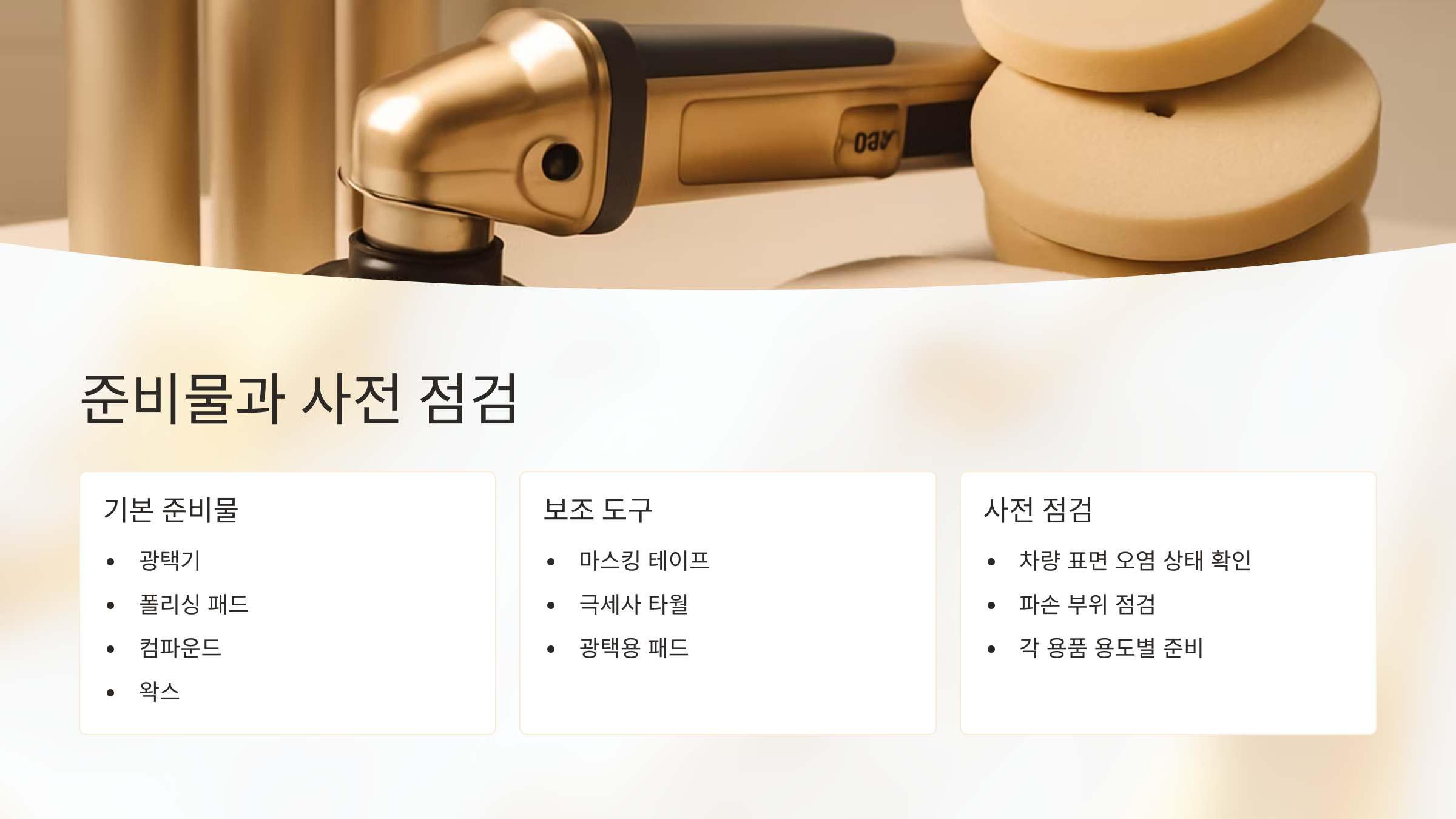 셀프 광택을 시작하기 전, 가장 중요한 건 준비물이 제대로 갖춰져 있는지 확인하는 거예요. 도구가 부족하거나 잘못된 제품을 사용하면 원하는 광택이 안 나올 수 있고, 도장면에 손상을 줄 수도 있거든요. 그래서 광택 전 준비 과정은 작업만큼이나 중요해요.
