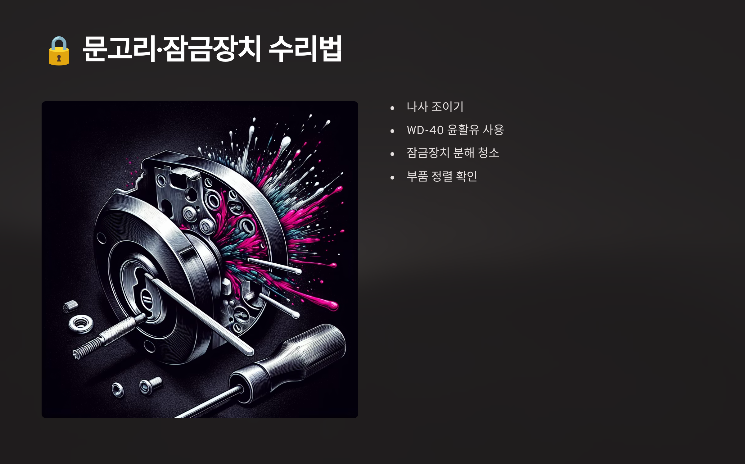 | 소리 삐걱거림 | 윤활제 부족 | WD-40 등 사용 |