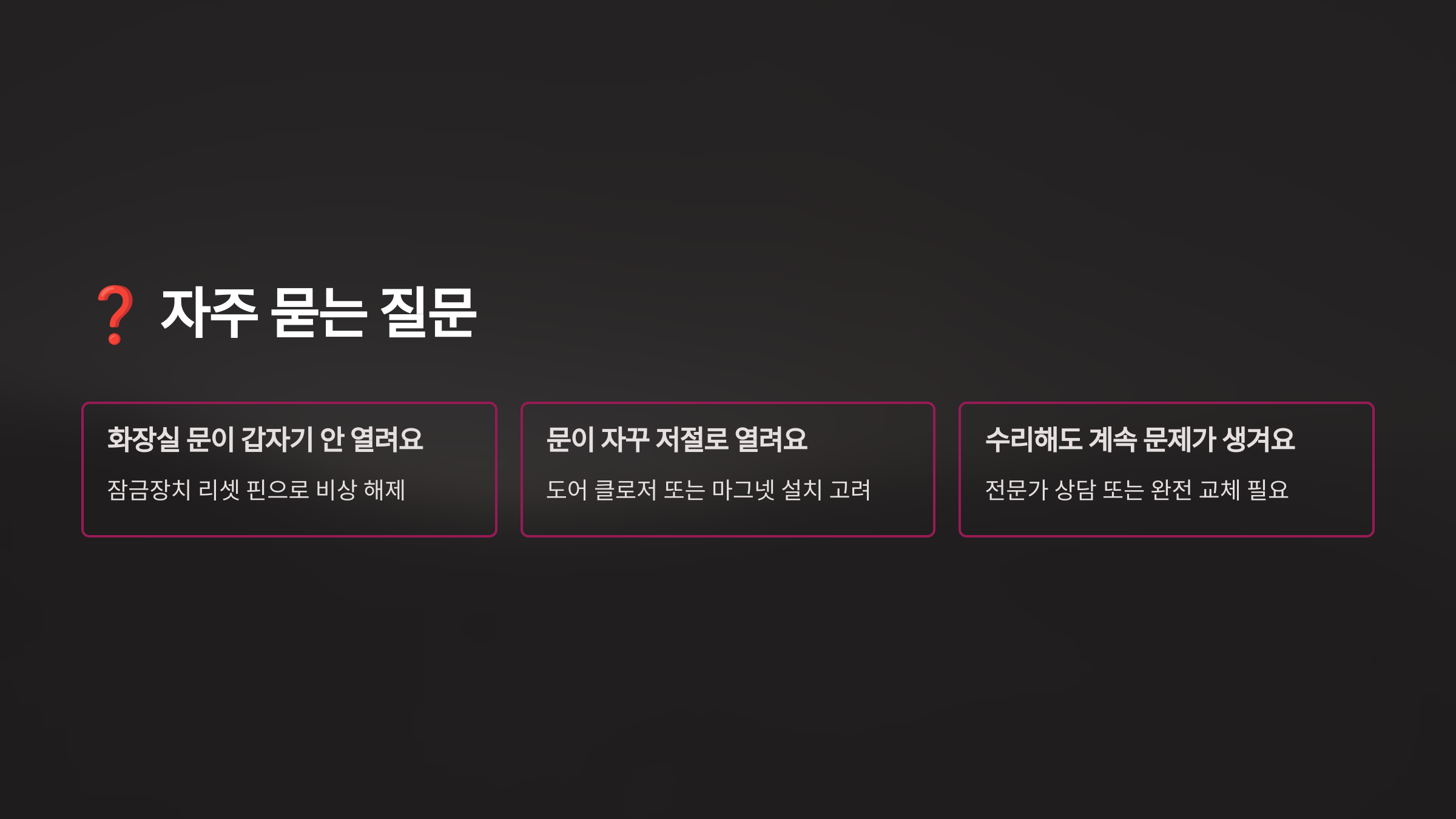내가 생각했을 때, 대부분의 화장실 문 문제는 간단한 조치로도 해결할 수 있어요. ‘문 자체가 망가졌을 것이다’라고 단정 짓기보다는 원인을 하나씩 점검해 보는 게 중요해요.