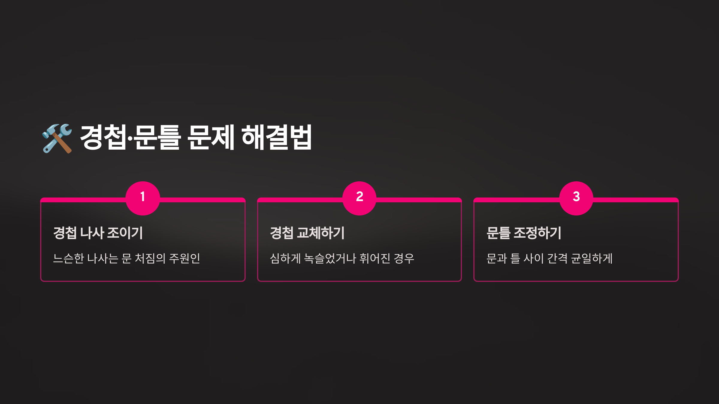👷 꼭 문 전체를 교체하지 않아도, 경첩이나 문틀 조정만으로 대부분의 문제가 해결돼요!