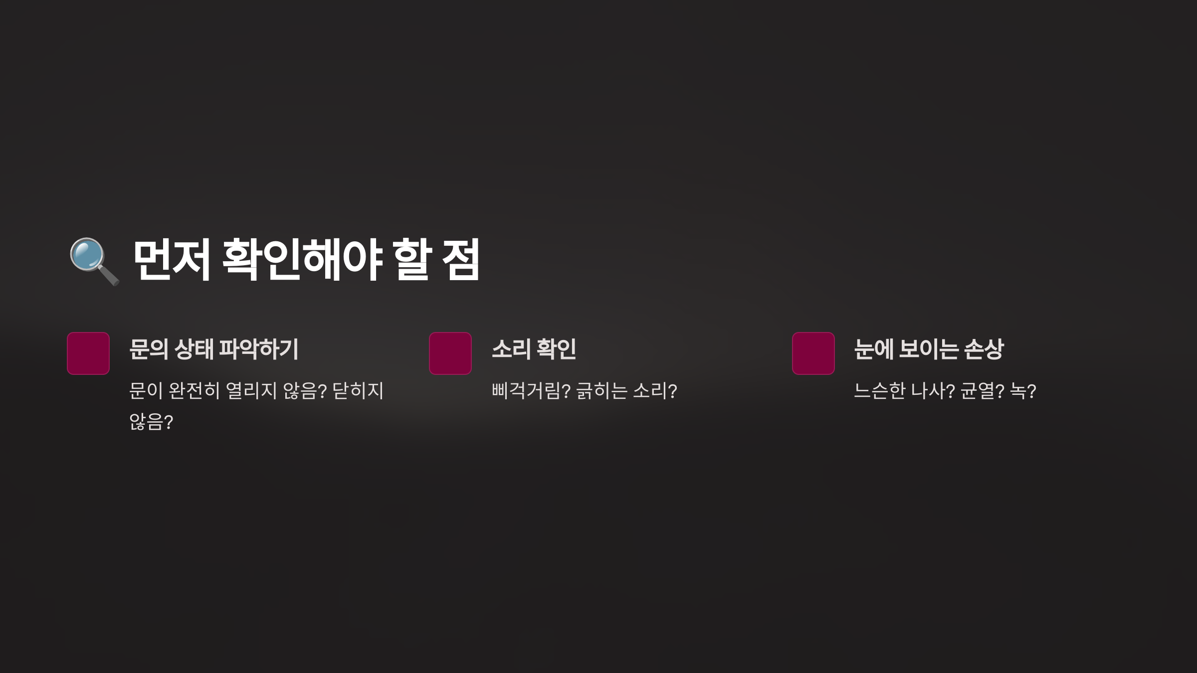 문을 열고 닫을 때 걸리는 느낌이 있나요? 그렇다면 문짝이 처지거나 문틀이 밀려 있을 수 있어요. 또는 경첩 나사가 풀려 있는 경우도 많죠. 손으로 살짝 흔들어보면 쉽게 확인할 수 있어요.