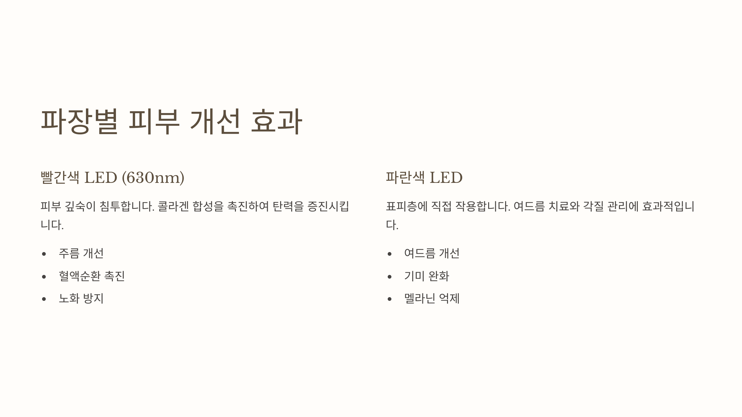 | 630nm (적색) | 콜라겐 생성, 탄력 개선 |